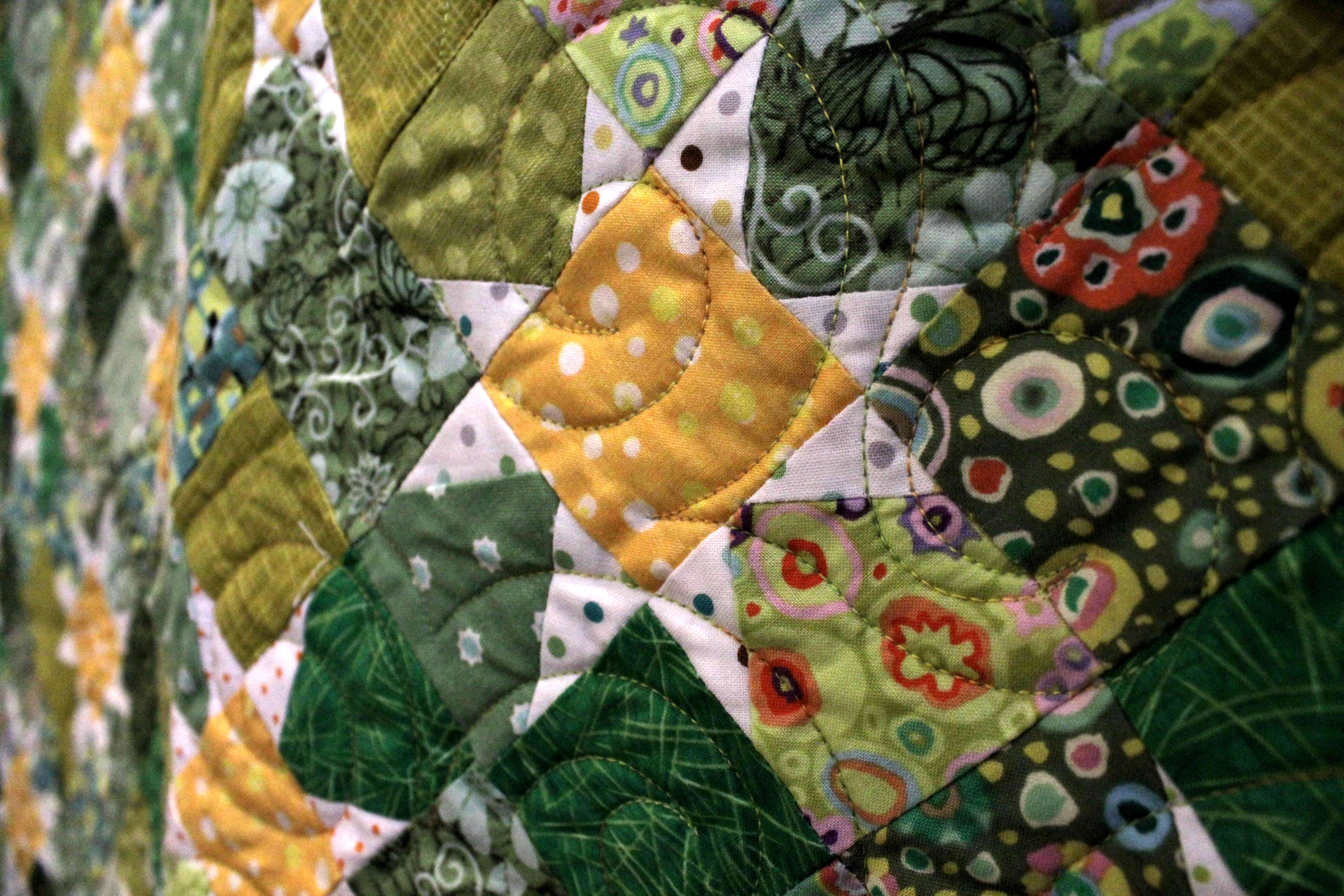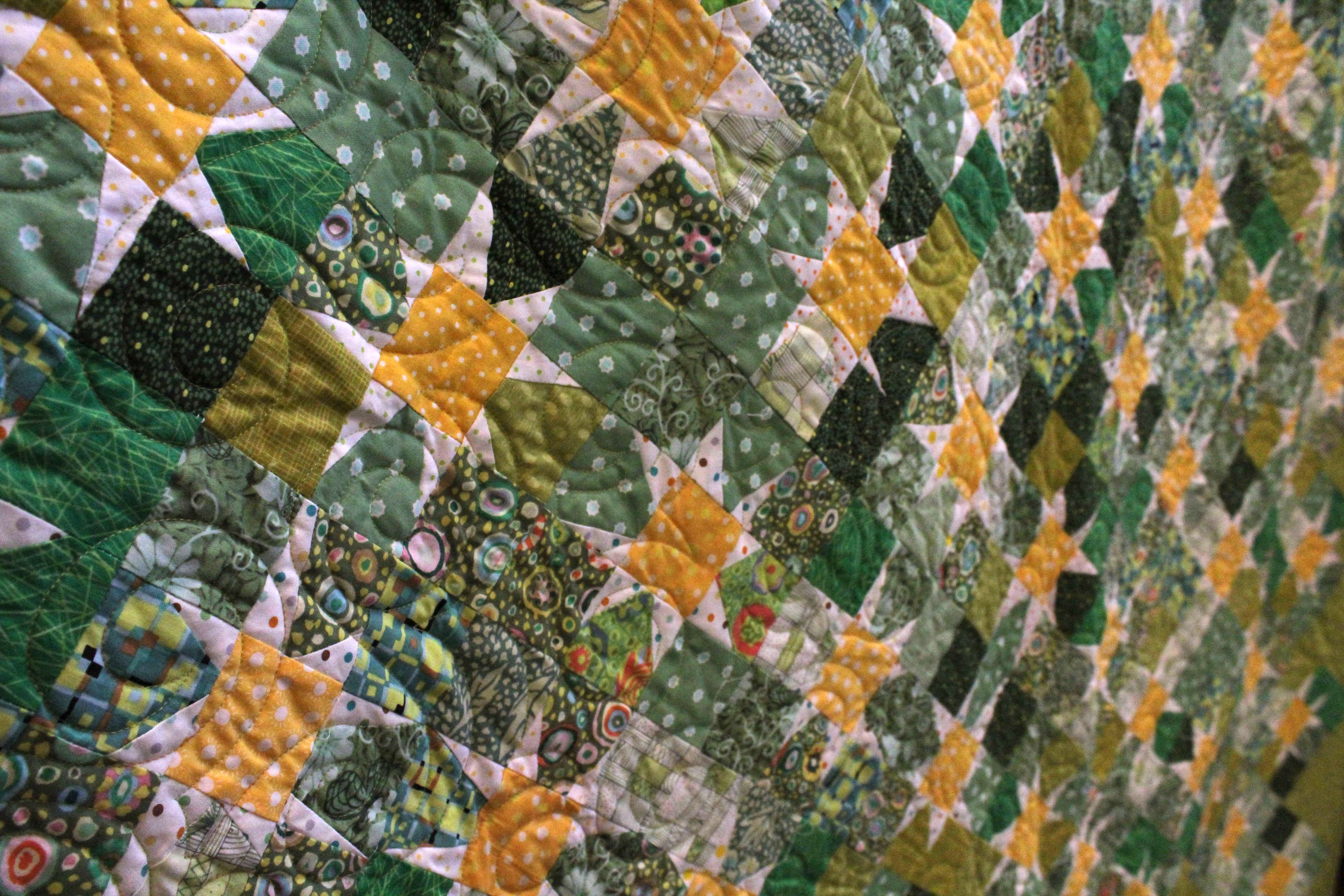 I have always loved dandelions, so I made a dandelion quilt. This is a very free form quilt. (Sewed by Jan, quilted by Hester Maestro.)