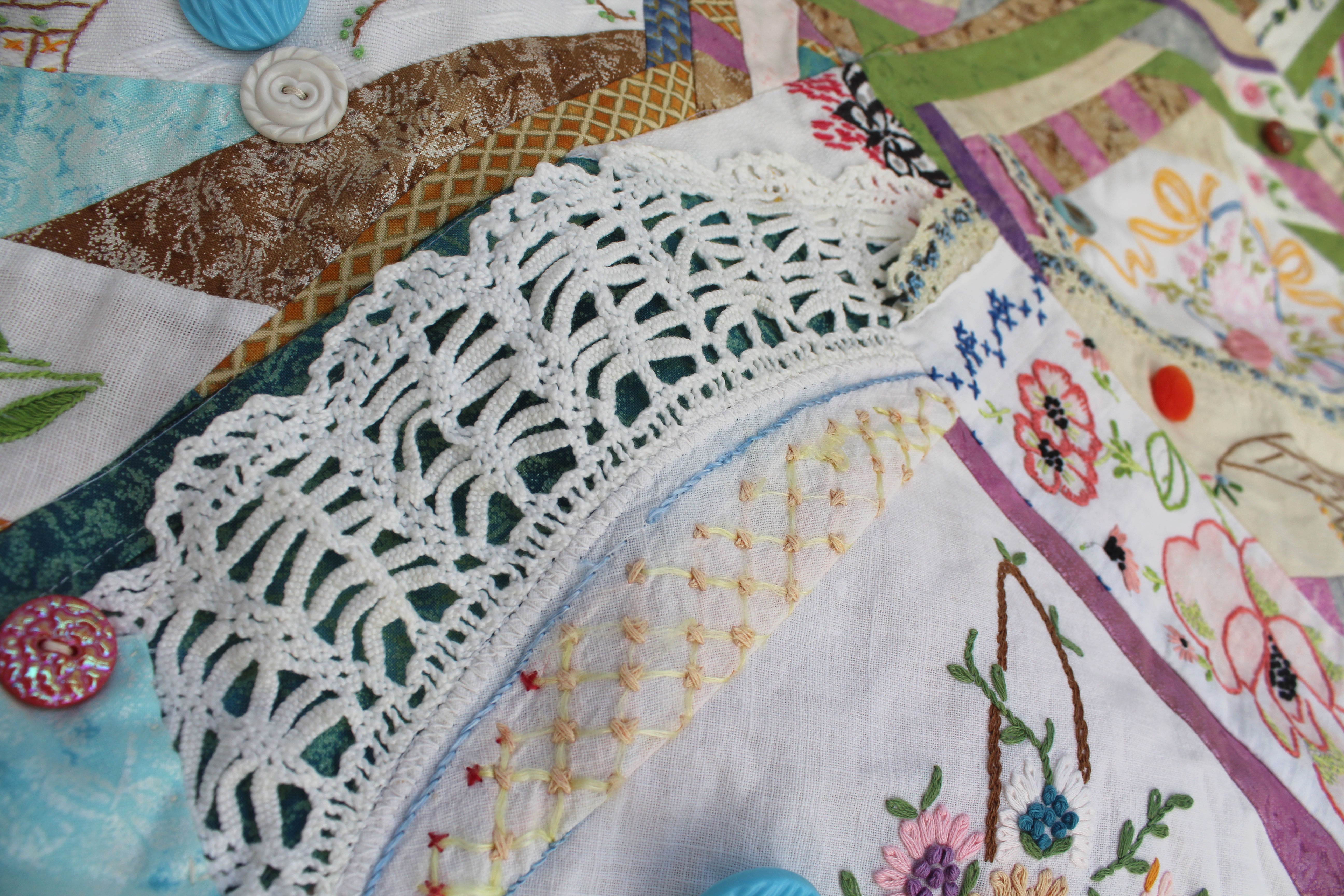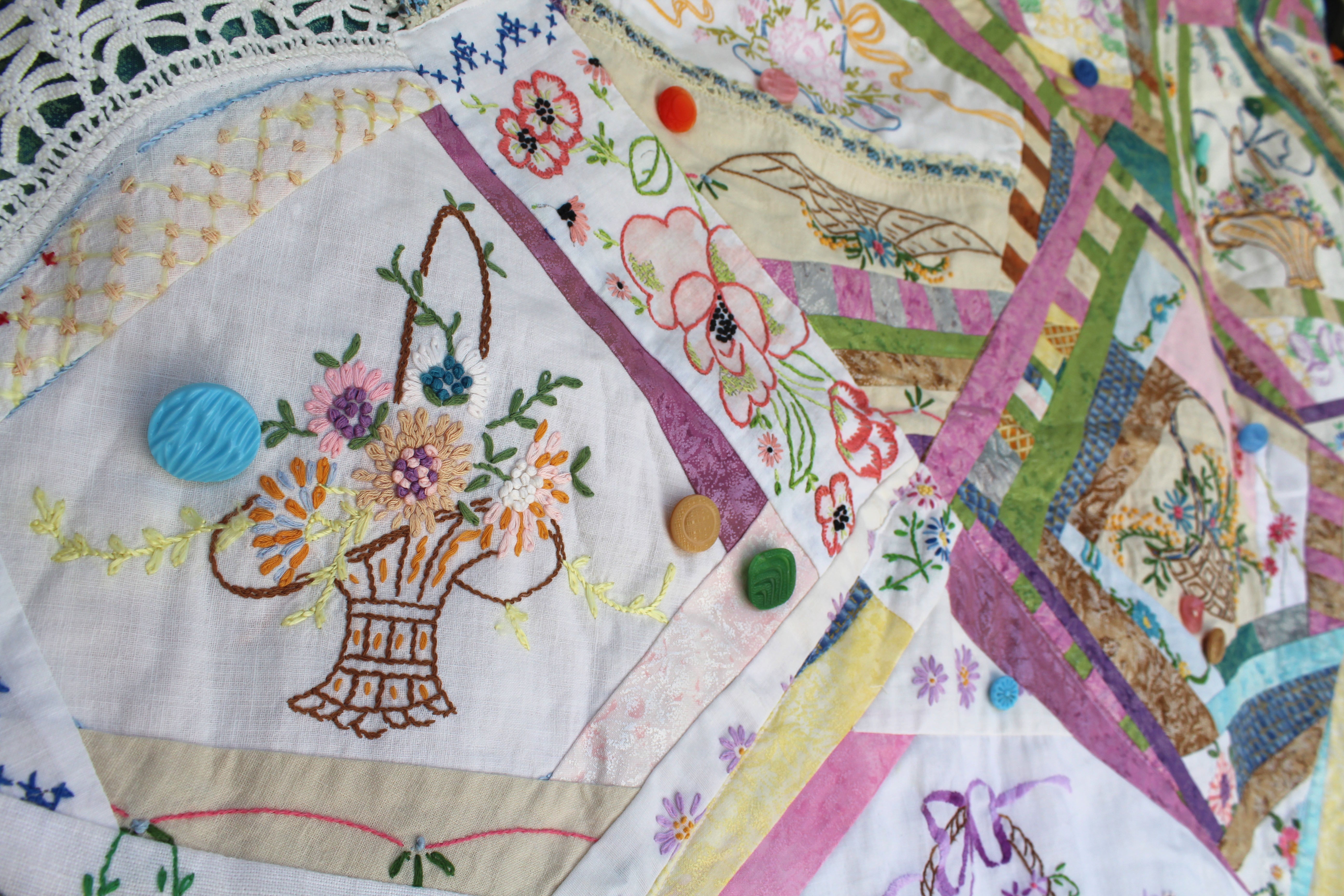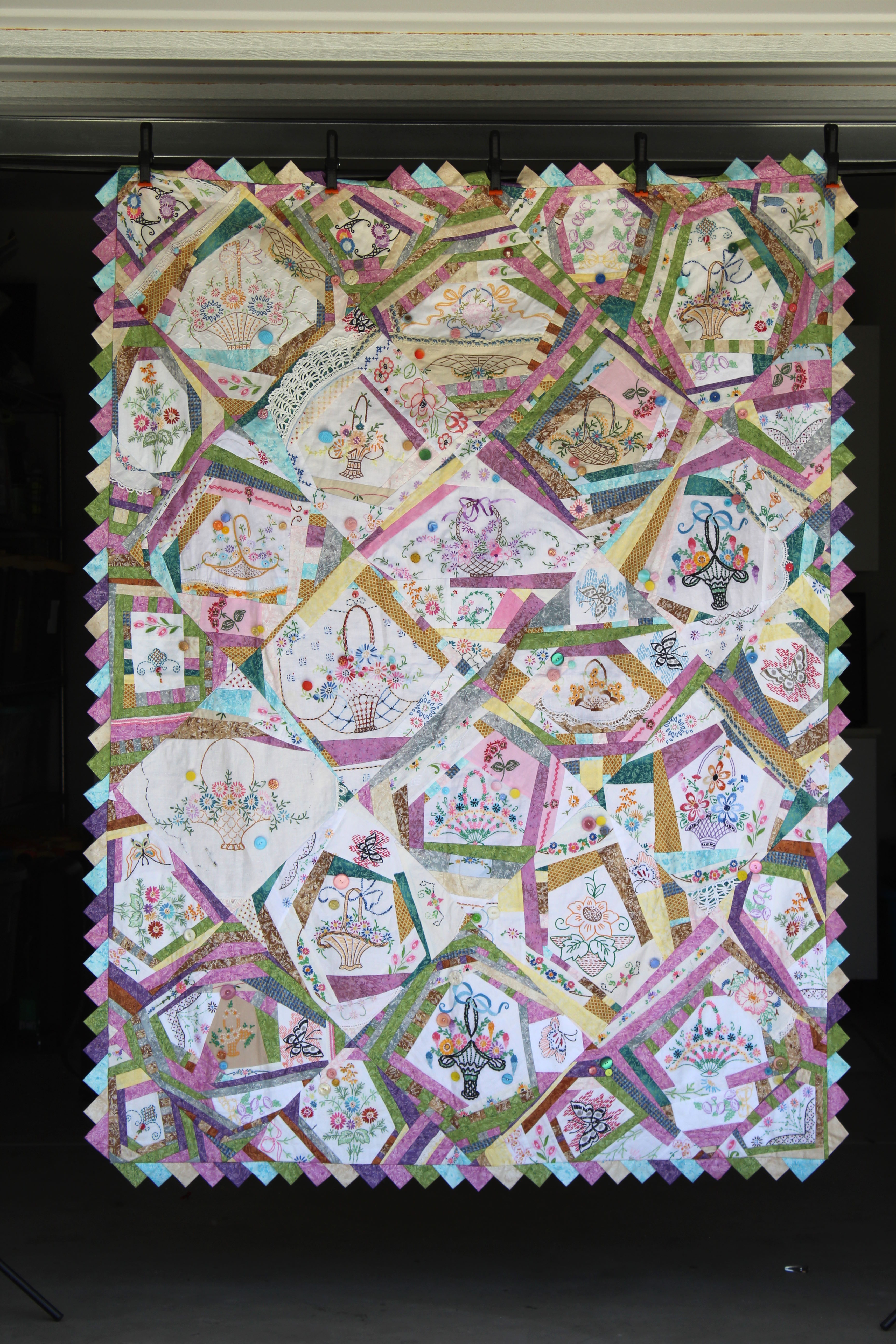 I made this crazy quilt in memory of my mother . This quilt uses vintage embroidered baskets that I have collected. I decorated it with old buttons, many from my mother’s button box and used prairie points for the border.