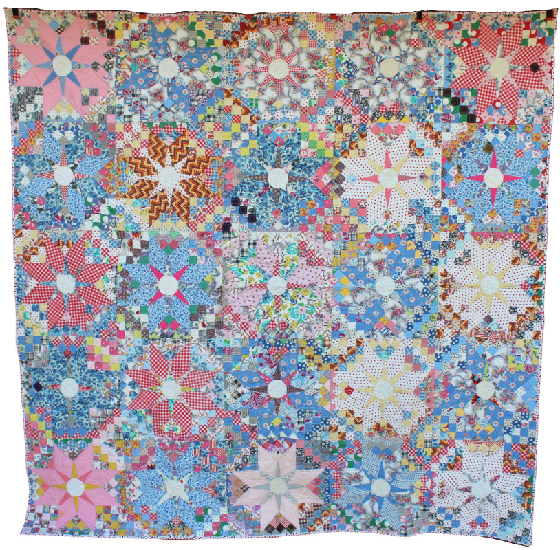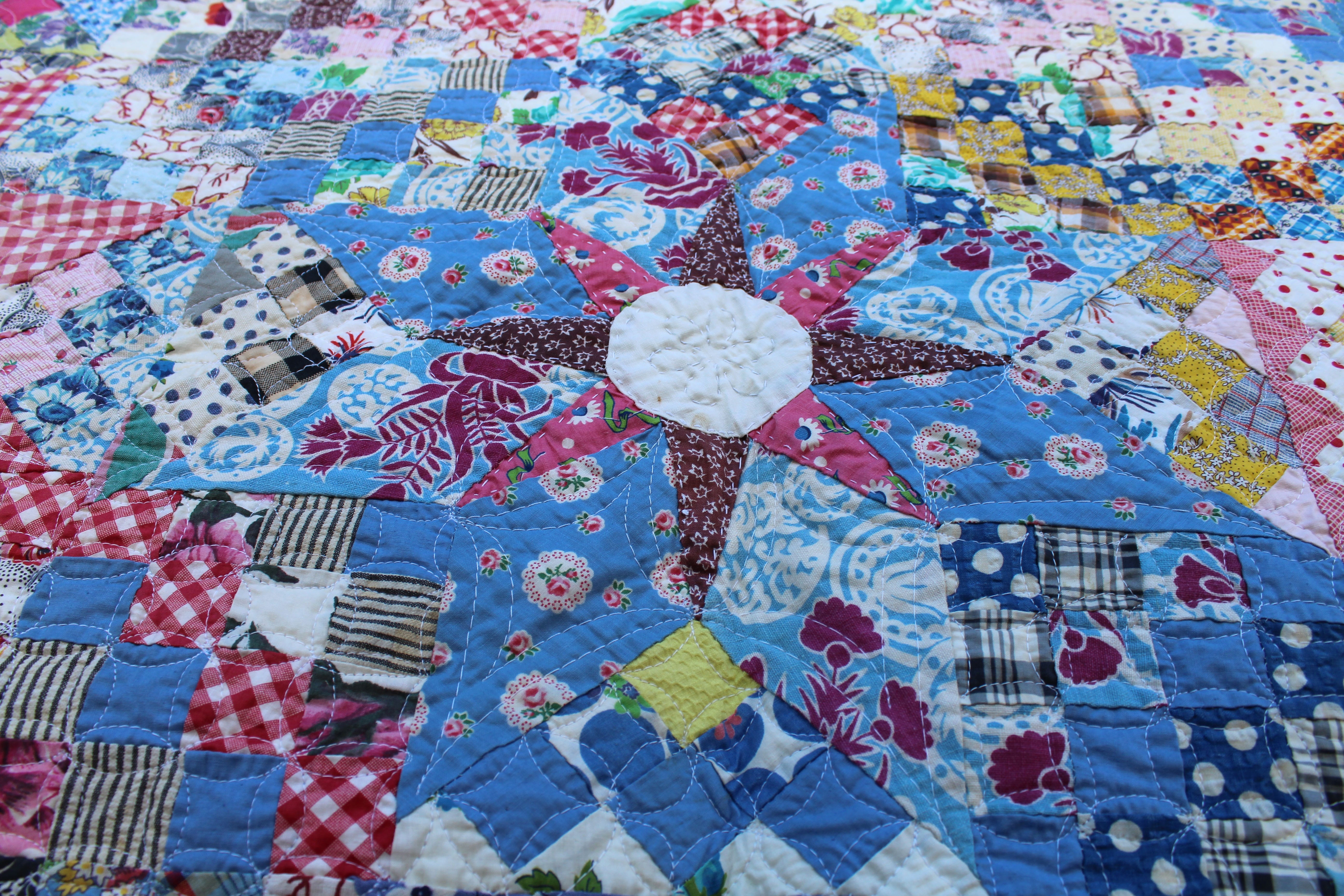 This quilt was hand-pieced by my mother Cleona and grandmother Hannah using scraps from making clothing. I did some hand quilting on it.